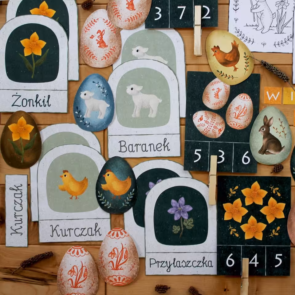 Wprowadź swoje dziecko w klimat Świąt Wielkanocnych poprzez zabawę i zarazem naukę! Będzie trochę przeliczania, wrażeń sensorycznych, zapamiętywania, ćwiczeń usprawniających motorykę małych rączek i kolorowania. Wszystko ubrane w piękną formę, która zachęca dziecko do czynnego udziału w aktywnościach.