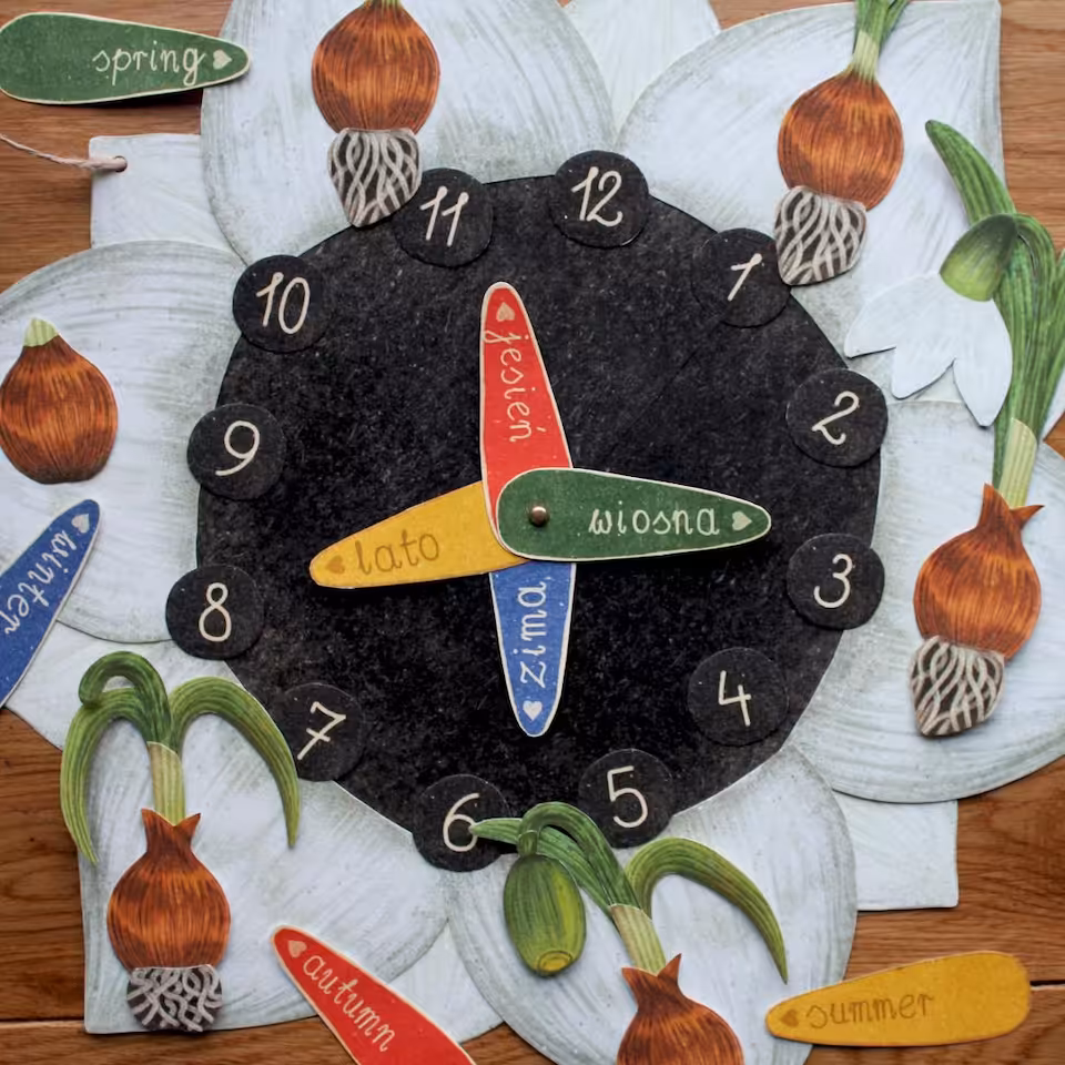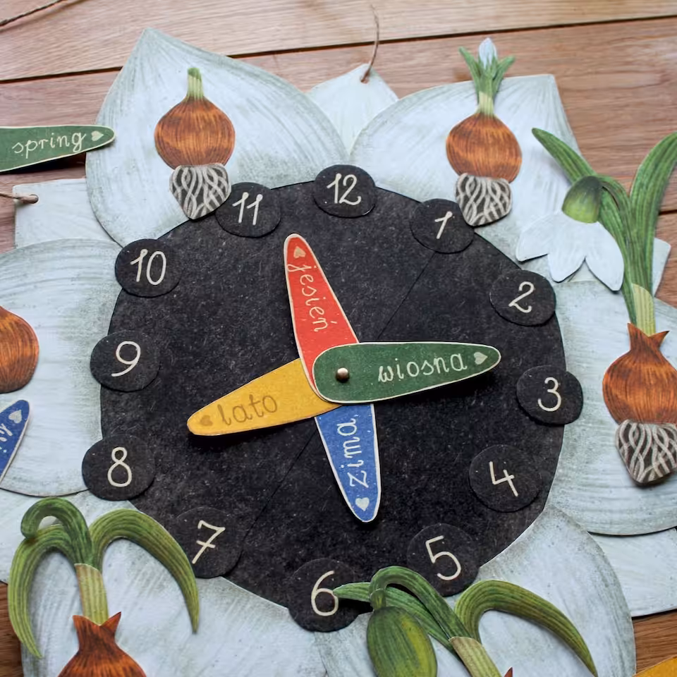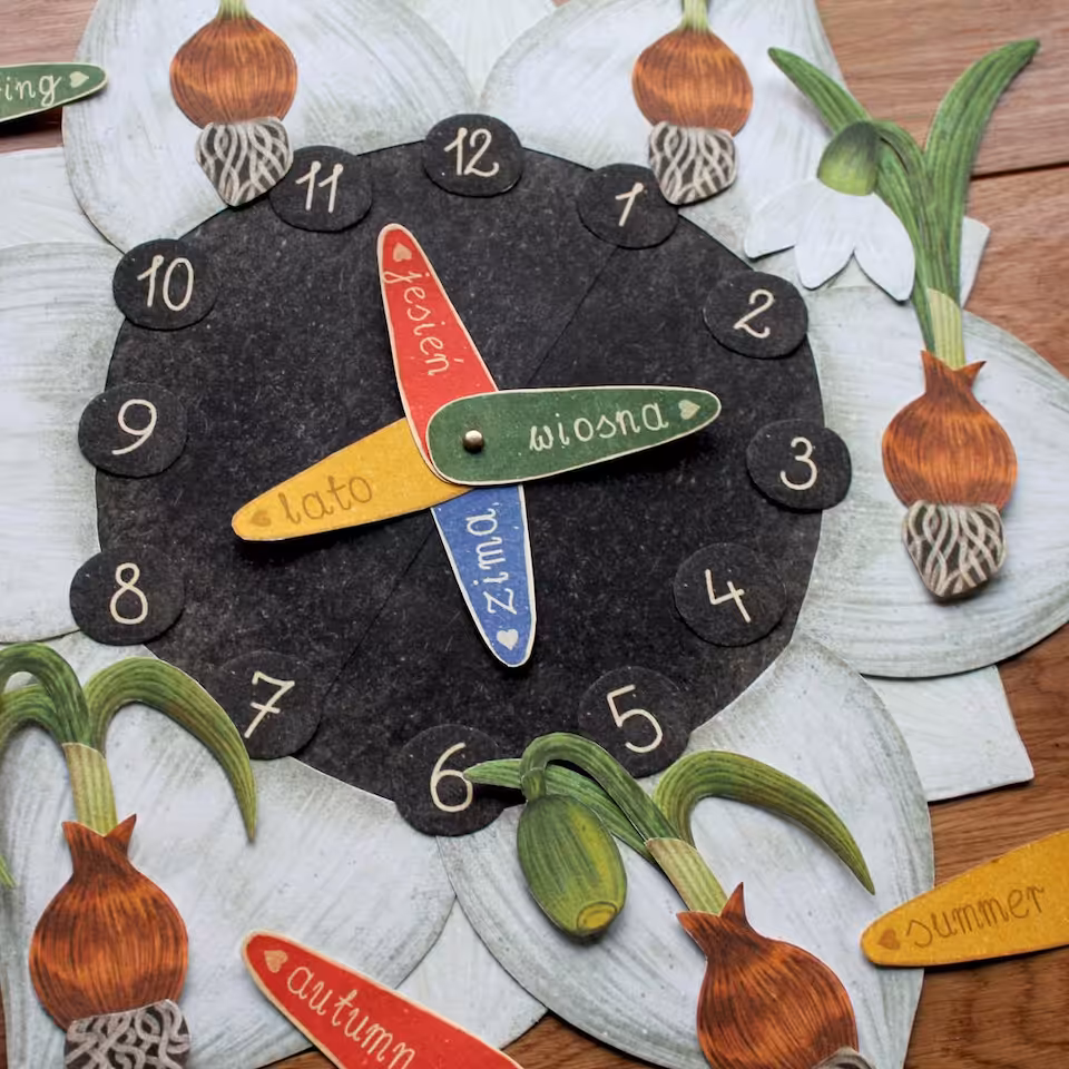 Kolorystyka zgodna z Montessori (wskazówki z porami roku).
