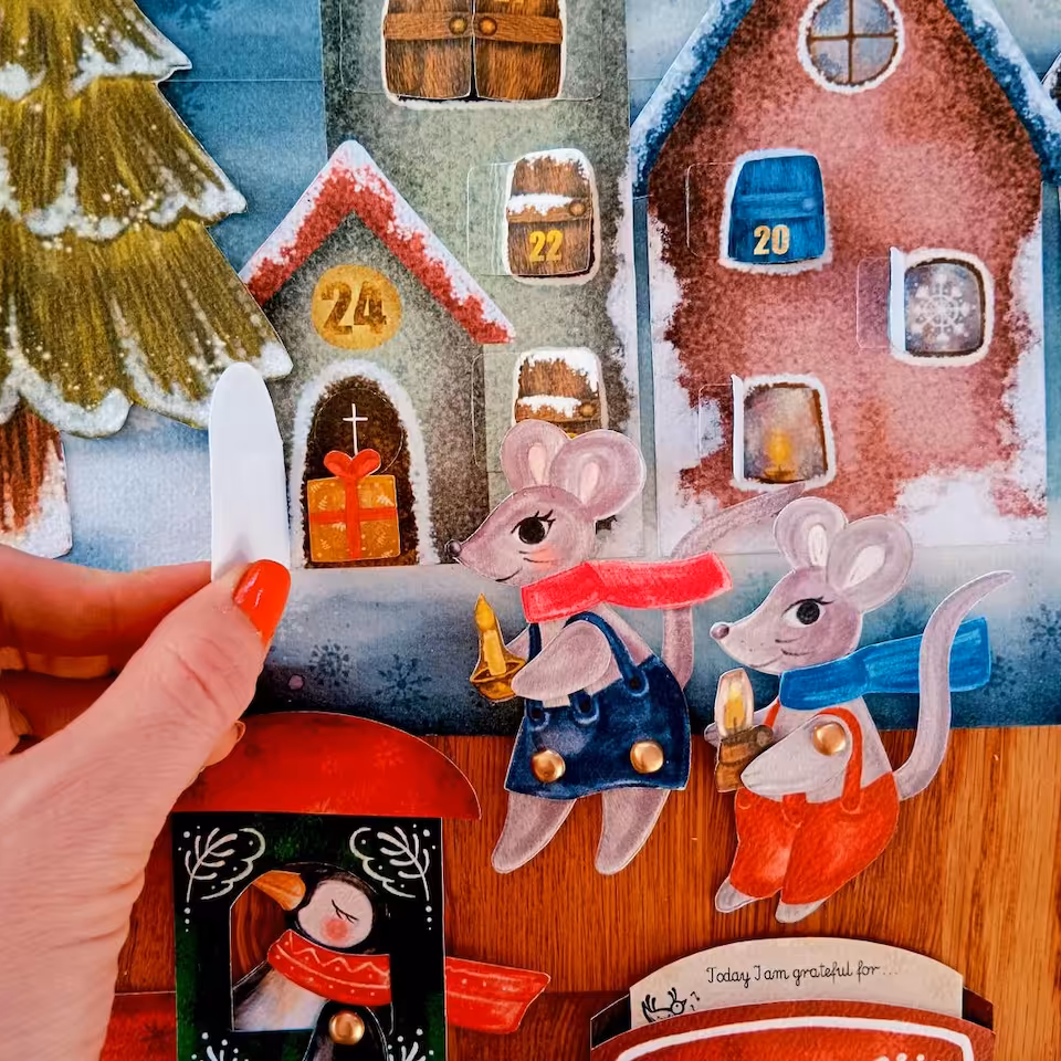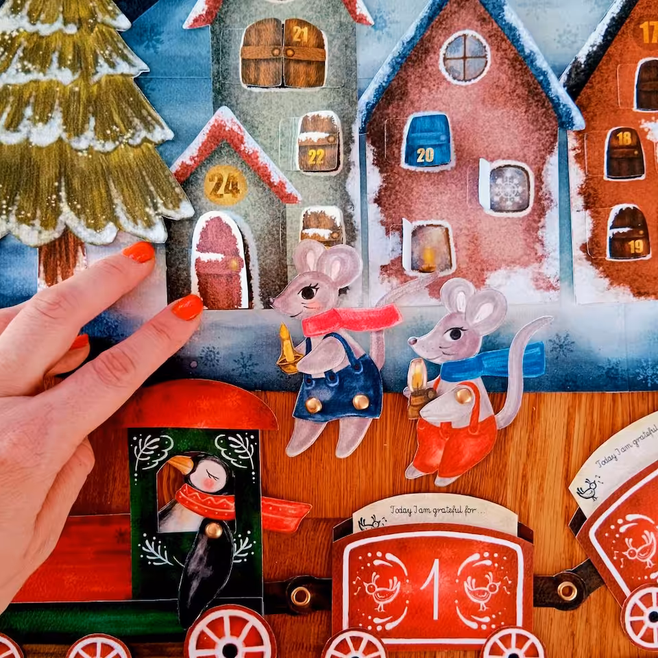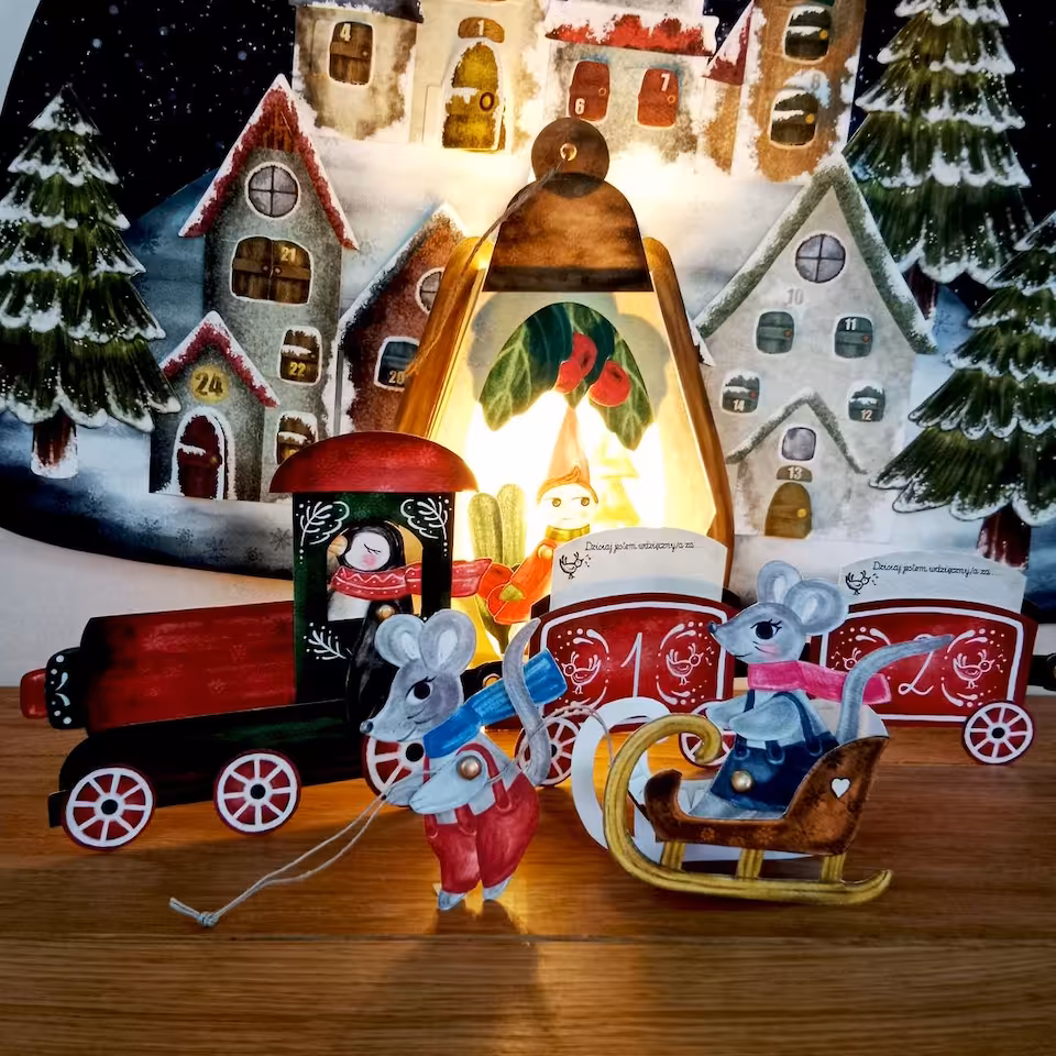 Adwent to wyjątkowy czas, kiedy przygotowujemy się do celebrowania świąt Bożego Narodzenia. Warto ten czas przeżyć w sposób szczególny i zatroszczyć się o sferę duchową. Ten kalendarz został przygotowany pod kątem ćwiczenia uważności oraz okazywania wdzięczności nawet z drobnych rzeczy, które doświadczamy każdego dnia. Zaproś swoje dziecko do tej pięknej przygody i razem przeżywajcie ten czas świadomie. W klimat świąteczny pomogą Wam wejść nasi bohaterowie. Dwie małe myszki, rodzeństwo Aleks i Rózia. Razem z nimi będziecie odkrywać każdego dnia nową literkę ukrytą za okiennicami i drzwiami kamieniczek w Zimowym Miasteczku. W drogę myszki zabiorą ze sobą lampę olejną. Znajdą również inne niespodzianki. Do kalendarza dołączona jest karta pracy, w której będziecie codziennie zapisywać literki. Ostatniego dnia Adwentu odkryjecie hasło świąteczne, ukryte w Zimowym Miasteczku. W miasteczku pojawił się także pociąg uważności. Konduktorem jest kolejny bohater, Pingwin. Zabierze Was w długą podróż pociagiem z 24 wagonami wdzięczności. Każdego dnia będziecie zapisywać na małej karteczce drobną rzecz, za która jesteście wdzięczni. W ten sposób nauczysz swoje dziecko cieszyć się nawet z najdrobniejszych rzeczy doświadczanych w życiu codziennym. Zestaw został wzbogacony o piękny lampion adwentowy inspirowany nauka Waldorfską, który możecie zabrać na roraty.