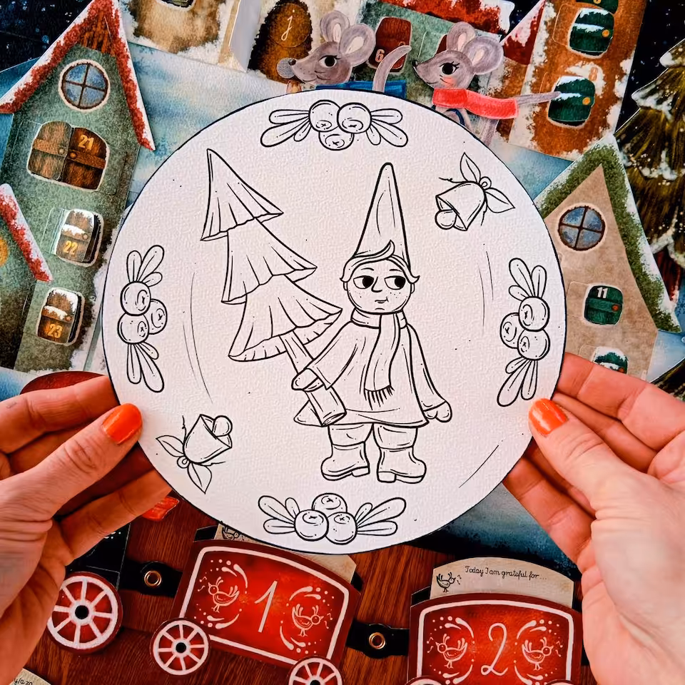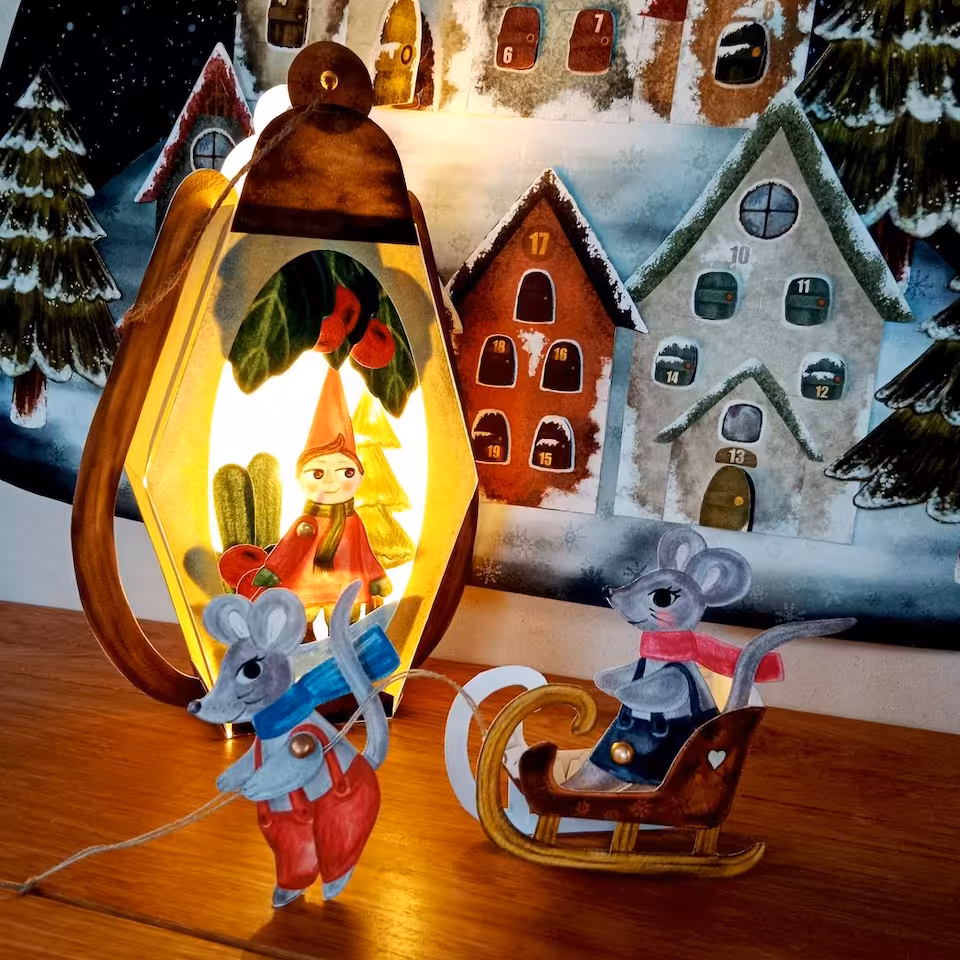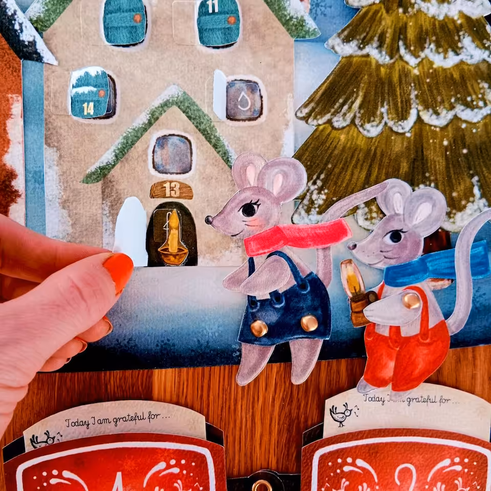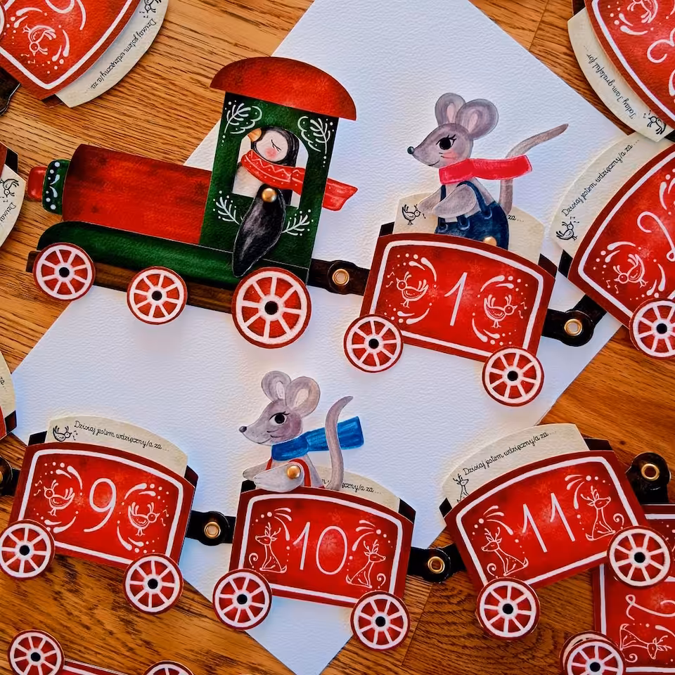 Adwent to wyjątkowy czas, kiedy przygotowujemy się do celebrowania świąt Bożego Narodzenia. Warto ten czas przeżyć w sposób szczególny i zatroszczyć się o sferę duchową. Ten kalendarz został przygotowany pod kątem ćwiczenia uważności oraz okazywania wdzięczności nawet z drobnych rzeczy, które doświadczamy każdego dnia. Zaproś swoje dziecko do tej pięknej przygody i razem przeżywajcie ten czas świadomie. W klimat świąteczny pomogą Wam wejść nasi bohaterowie. Dwie małe myszki, rodzeństwo Aleks i Rózia. Razem z nimi będziecie odkrywać każdego dnia nową literkę ukrytą za okiennicami i drzwiami kamieniczek w Zimowym Miasteczku. W drogę myszki zabiorą ze sobą lampę olejną. Znajdą również inne niespodzianki. Do kalendarza dołączona jest karta pracy, w której będziecie codziennie zapisywać literki. Ostatniego dnia Adwentu odkryjecie hasło świąteczne, ukryte w Zimowym Miasteczku. W miasteczku pojawił się także pociąg uważności. Konduktorem jest kolejny bohater, Pingwin. Zabierze Was w długą podróż pociagiem z 24 wagonami wdzięczności. Każdego dnia będziecie zapisywać na małej karteczce drobną rzecz, za która jesteście wdzięczni. W ten sposób nauczysz swoje dziecko cieszyć się nawet z najdrobniejszych rzeczy doświadczanych w życiu codziennym. Zestaw został wzbogacony o piękny lampion adwentowy inspirowany nauka Waldorfską, który możecie zabrać na roraty.