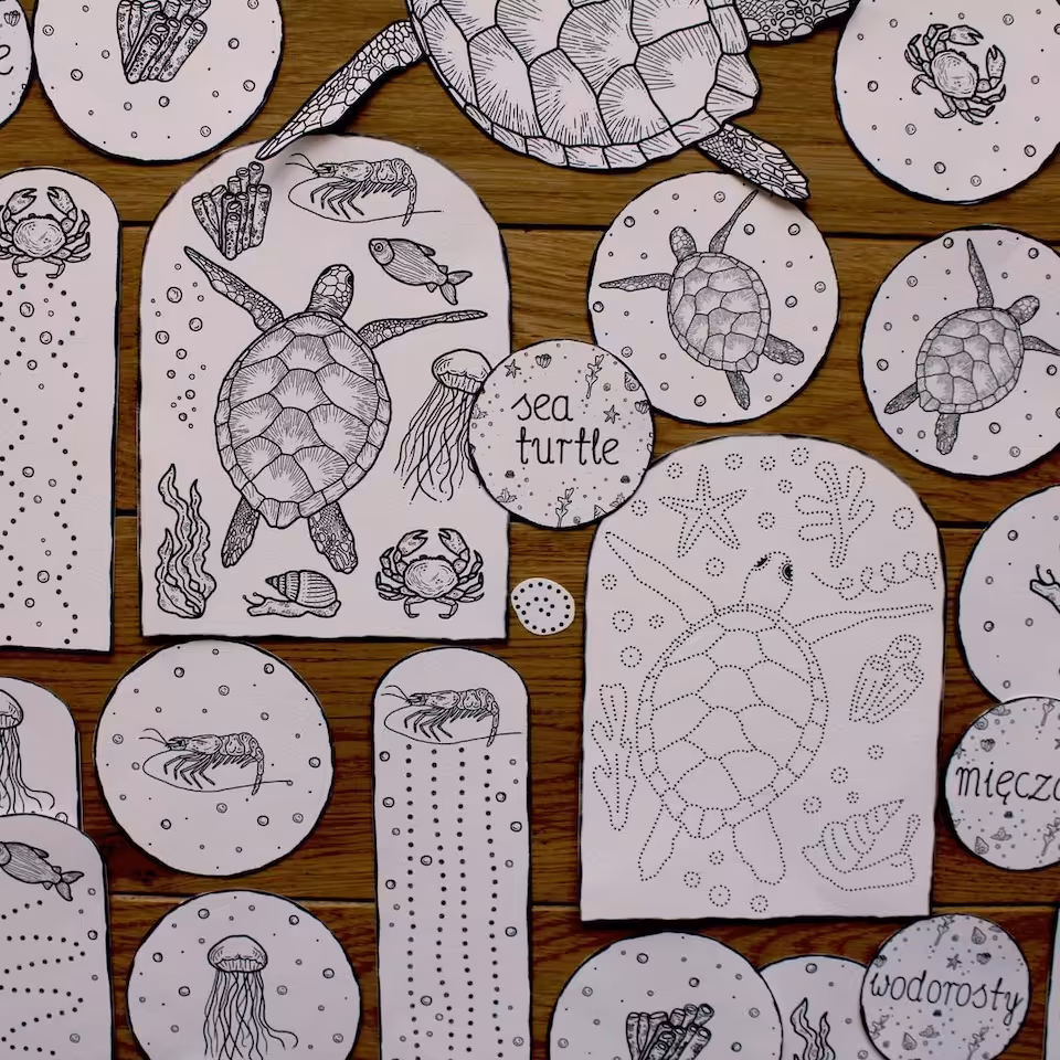 Makieta aktywizująca do zabawy i nauki dla dzieci. Wydrukuj i baw się razem z dzieckiem. Kolorowanki do wycinania. Aktywności Montessori. Materiały obejmują zagadnienia z życia żółwi morskich. Wydane w formie pięknych i niepowtarzalnych ilustracji ♥.
