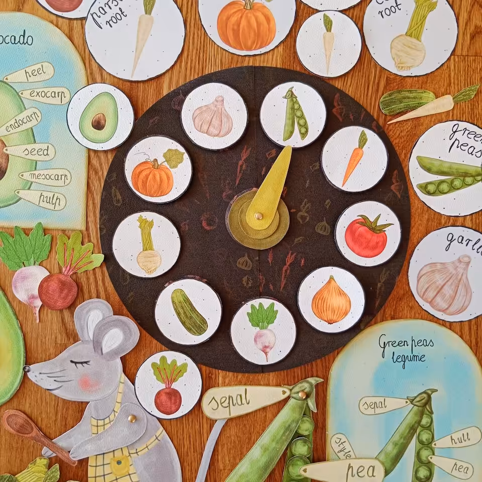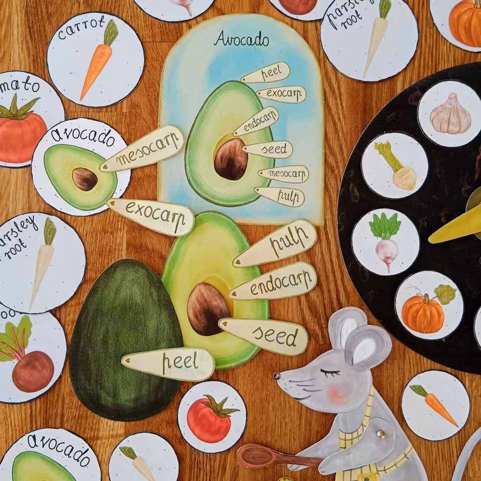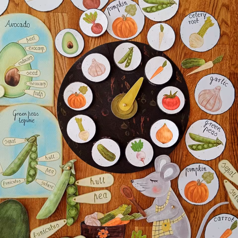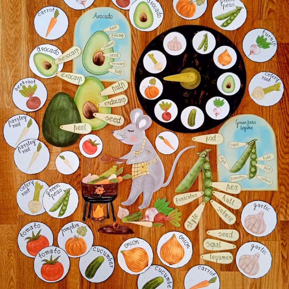 Warzywne Aktywności na każdą porę roku. Pani Anna Mysz i Warzywa. Zabawy Montessori inspirowane naturą. Anatomia zielonego groszku. Anatomia Awokado. Matematyka dla najmłodszych. Pomoce edukacyjne rozwijające kreatywność i zmysły. Nauka języka angielskiego poprzez zabawę, Materiały ręcznie malowane. E-book ❀.